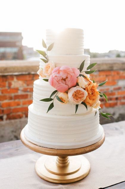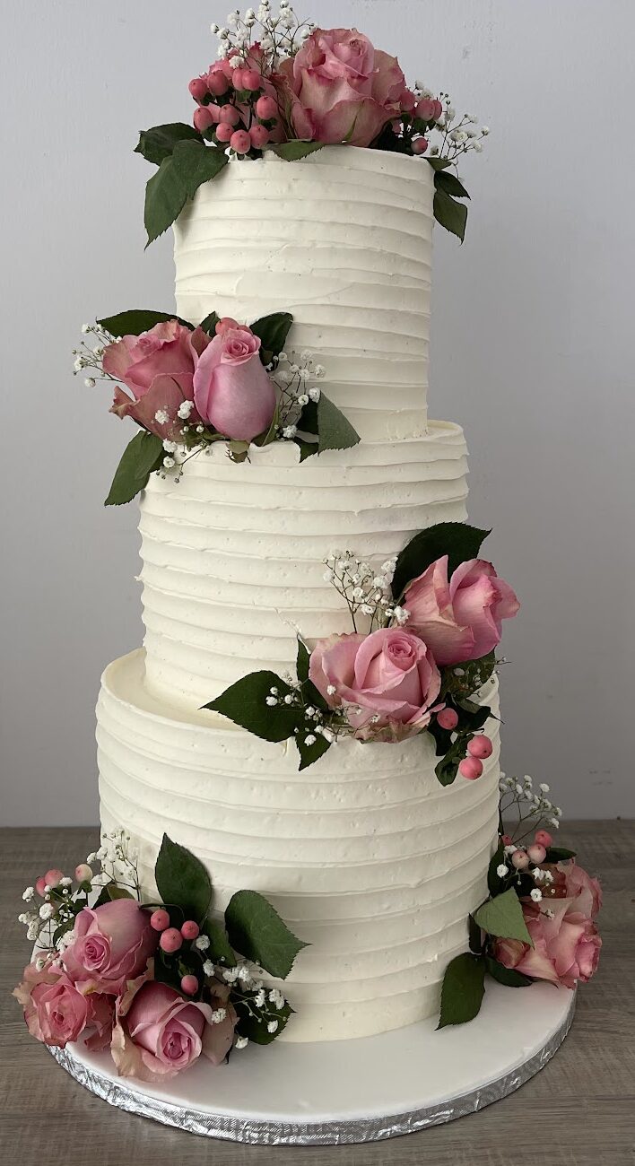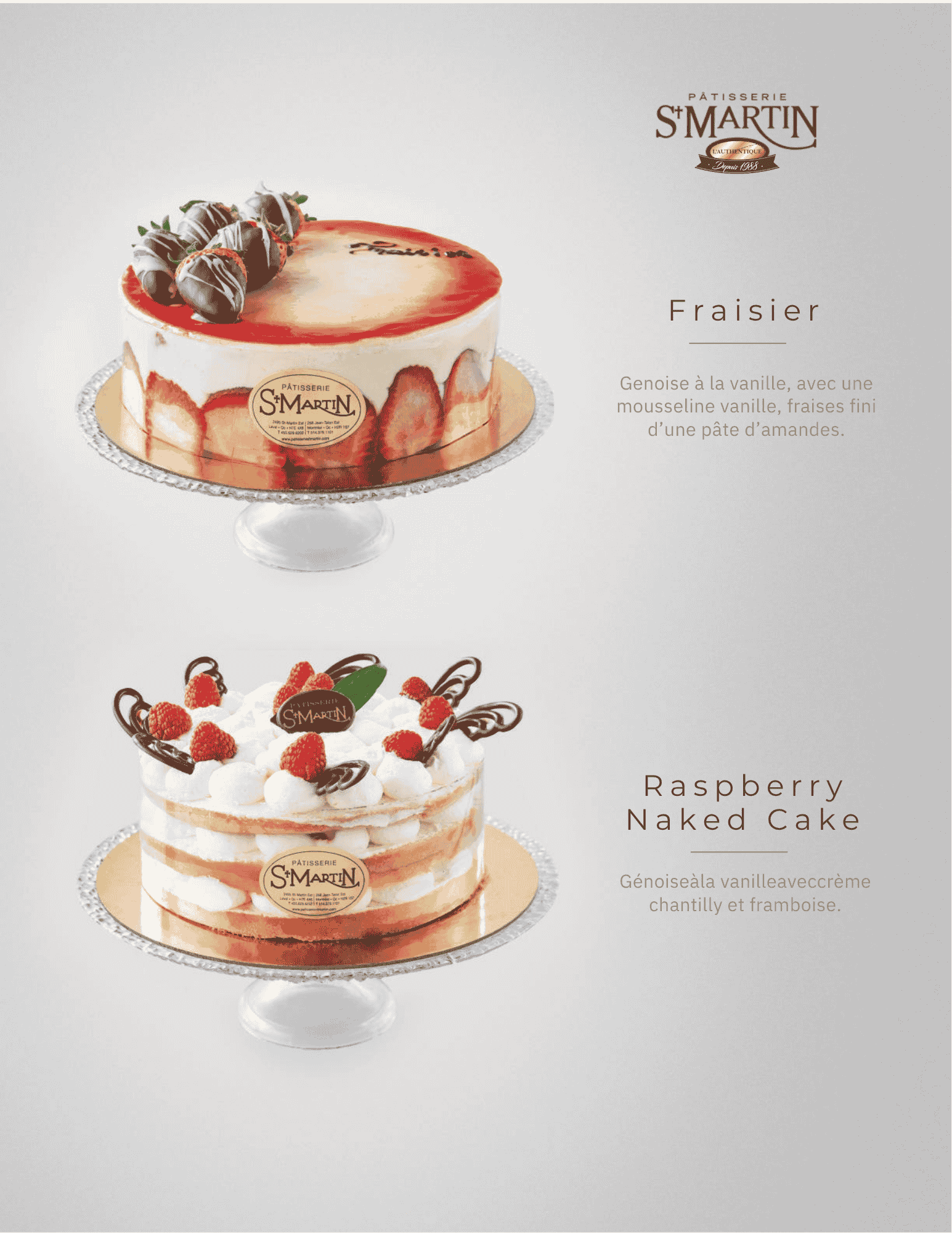 Gâteaux Crème Légère Fruits Frais Gâteau vanille imbibé de sirop neutre, crème légère et chantilly à l’intérieur avec fraise et pêche, extérieur décoré d’un mélange de fruits frais et brisures de crêpes.