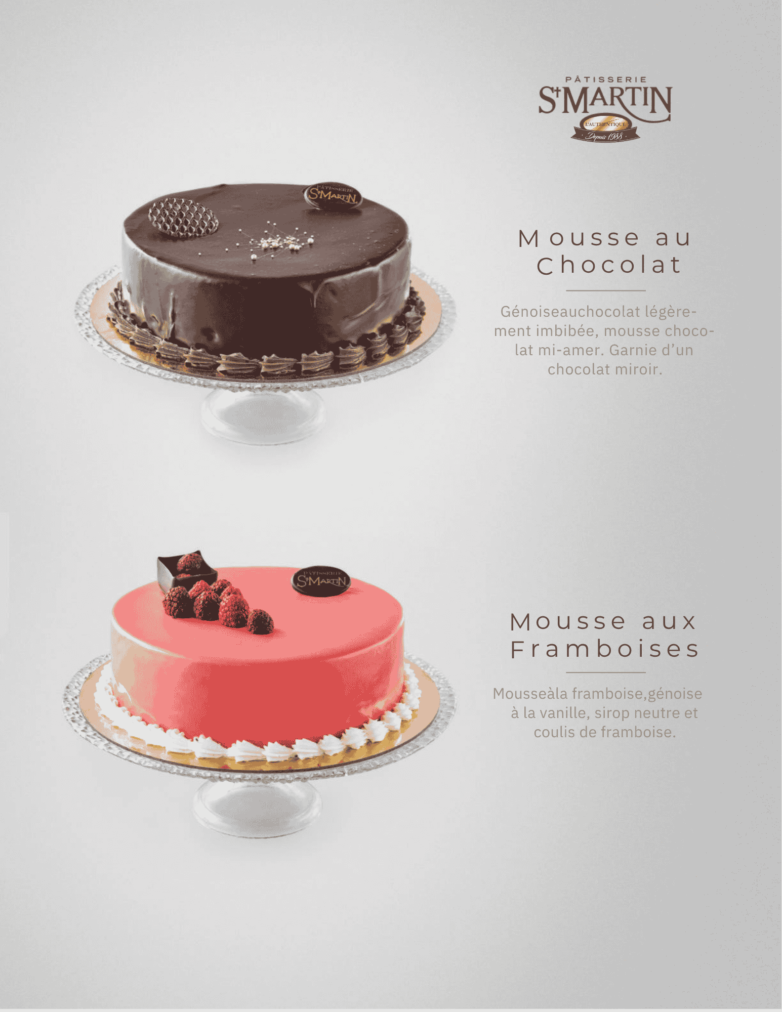 Mousse Chocolat Génoise chocolat légèrement imbibée, mousse chocolat mi-amer, finie d’un miroir chocolaté pour une finition lustrée et raffinée.