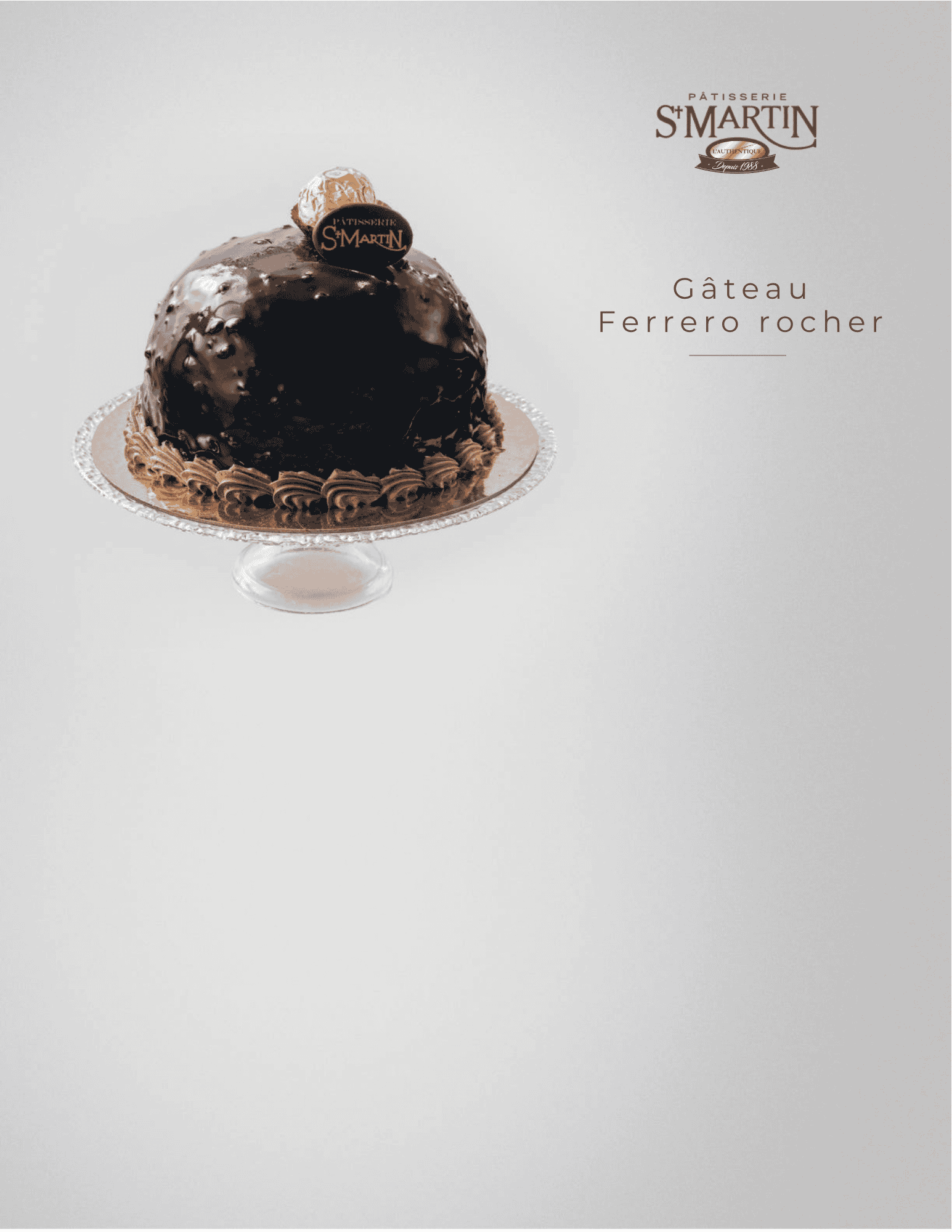 Ferrero Rocher Gâteau éponge chocolat imbibé de sirop neutre, crème légère Nutella et base croquante façon Ferrero Rocher.