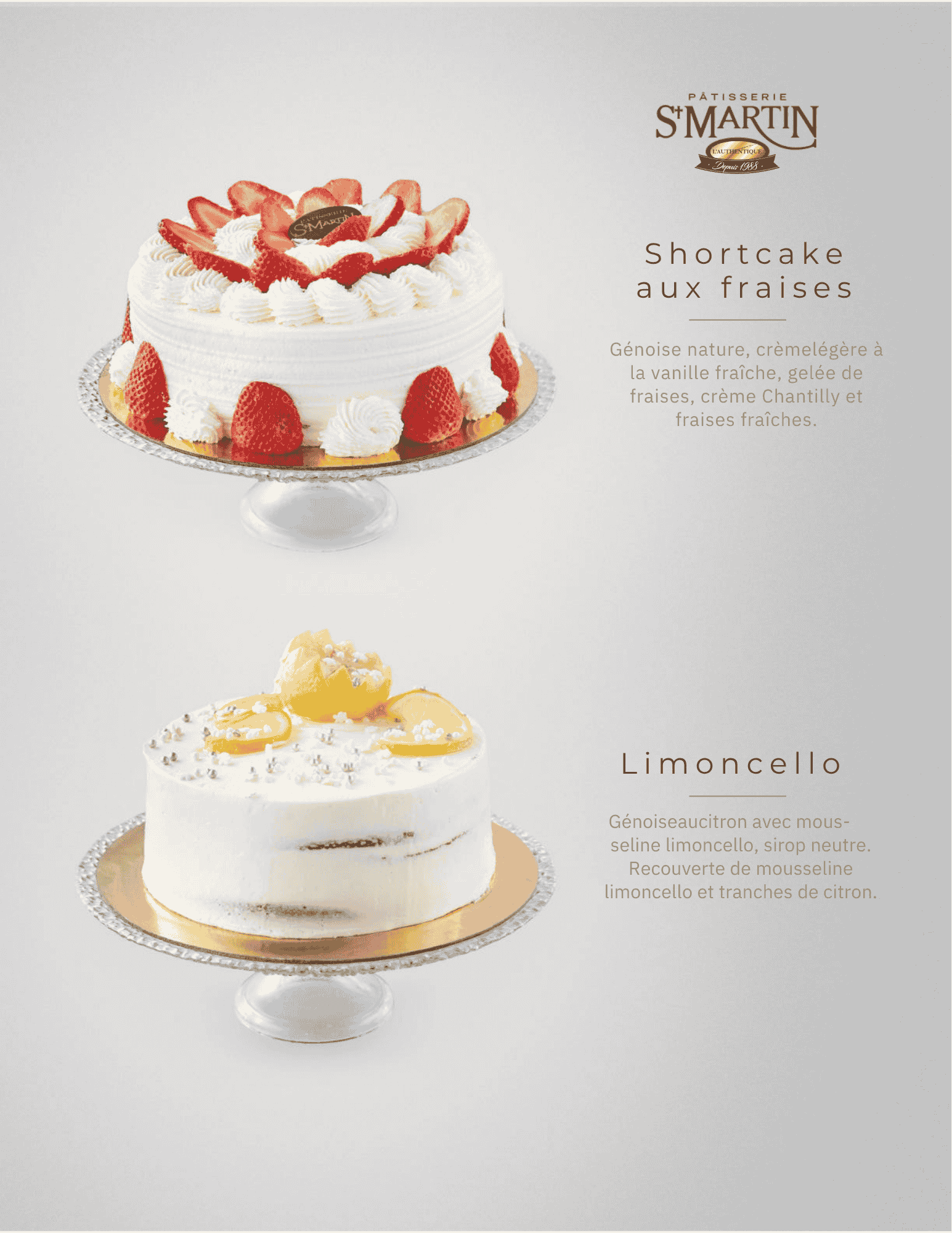 Shortcake aux fraises Génoise nature, crème légère à la vanille fraîche, gelée de fraises, crème Chantilly et fraises fraîches.