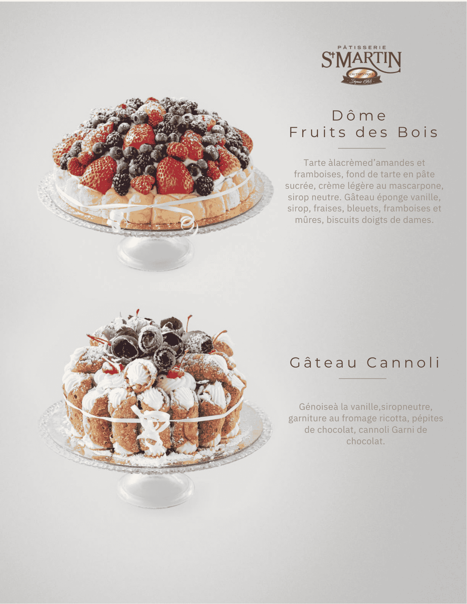 Gâteaux Fruits des Bois Gâteau vanille imbibé de sirop neutre, garni de crème légère et chantilly, fruits rouges (fraise, framboise, mûre et bleuet) et biscuits doigts de dame.