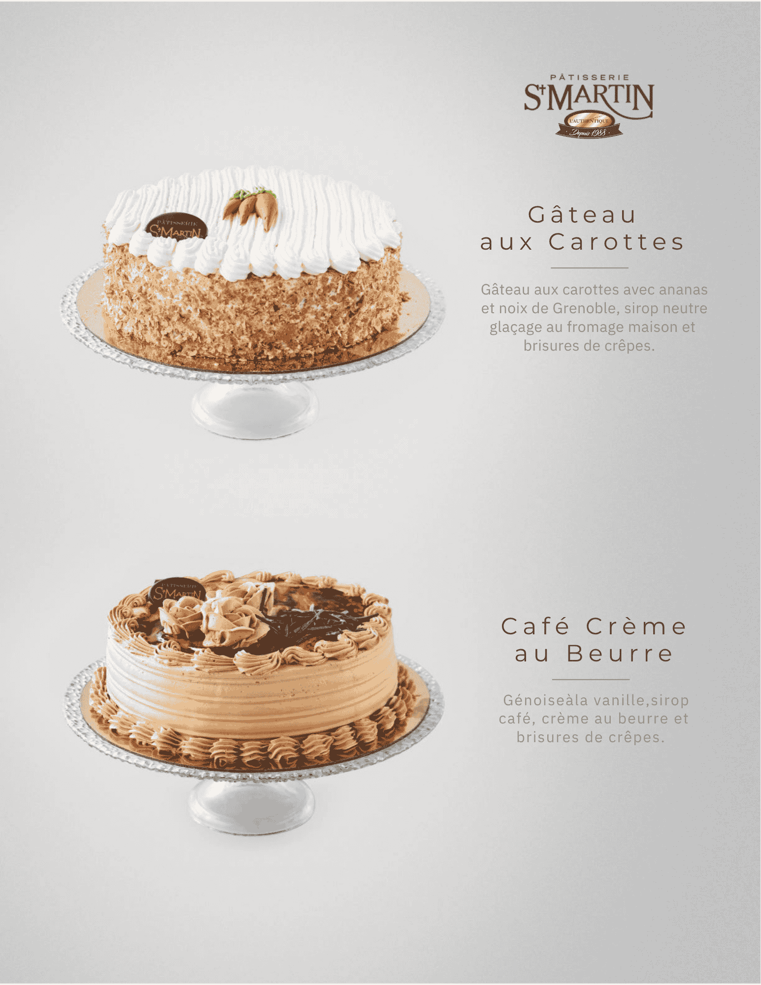 Café Crème Beurre Gâteau éponge vanille imbibé de sirop café, garni de crème au beurre et de brisures de crêpes.