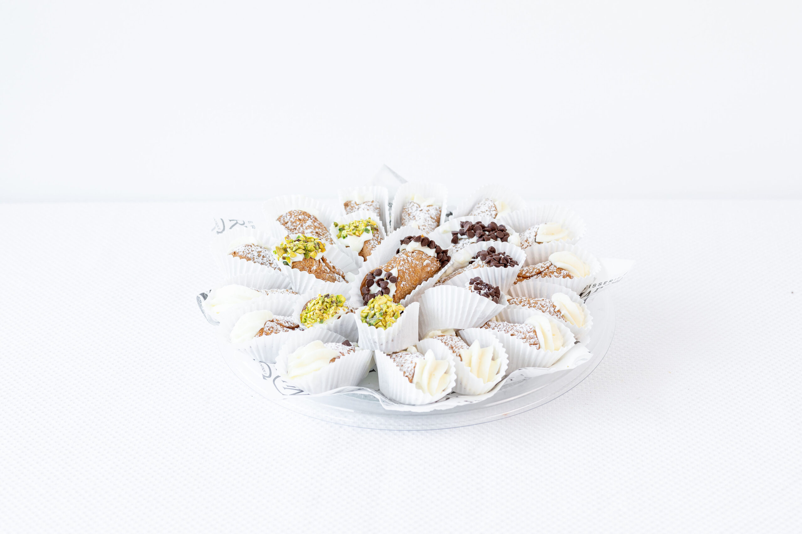 Petits cannoli italiens garnis de crème sucrée et décorés de chocolat ou pistaches.