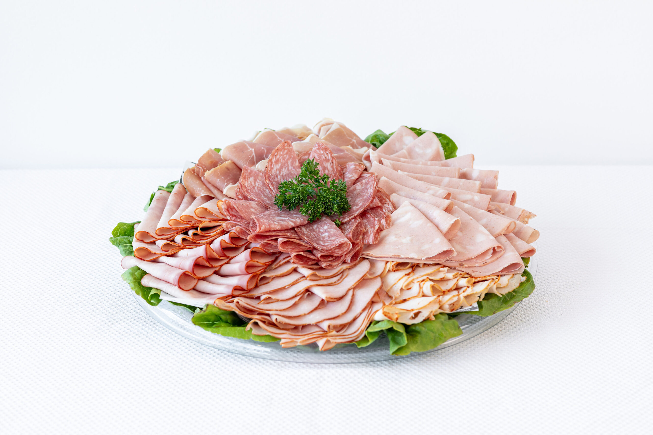 Assortiment de viandes froides tranchées, présenté sur un lit de verdure fraîche.