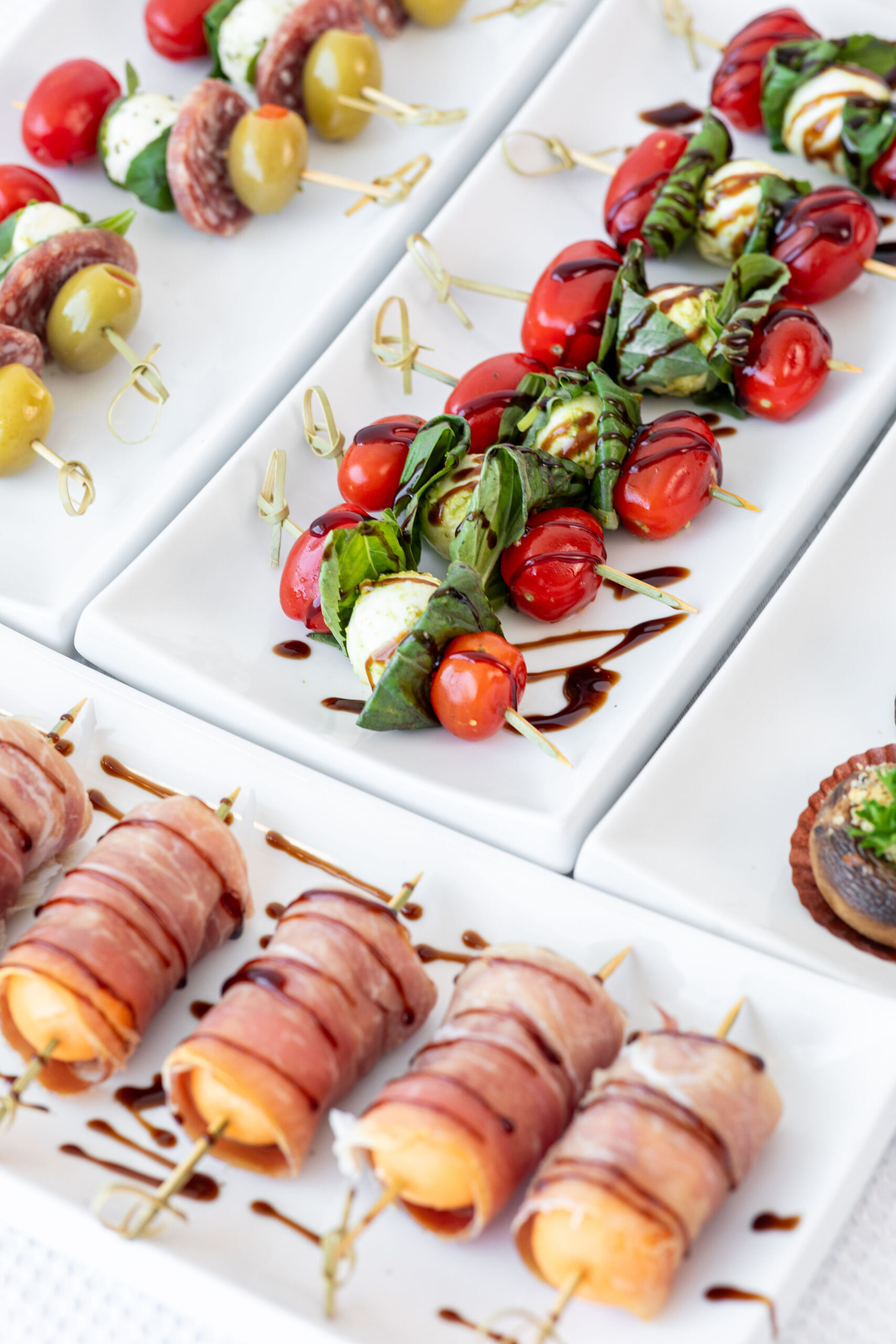 Petites brochettes composées de tomates, bocconcini et autres ingrédients frais.