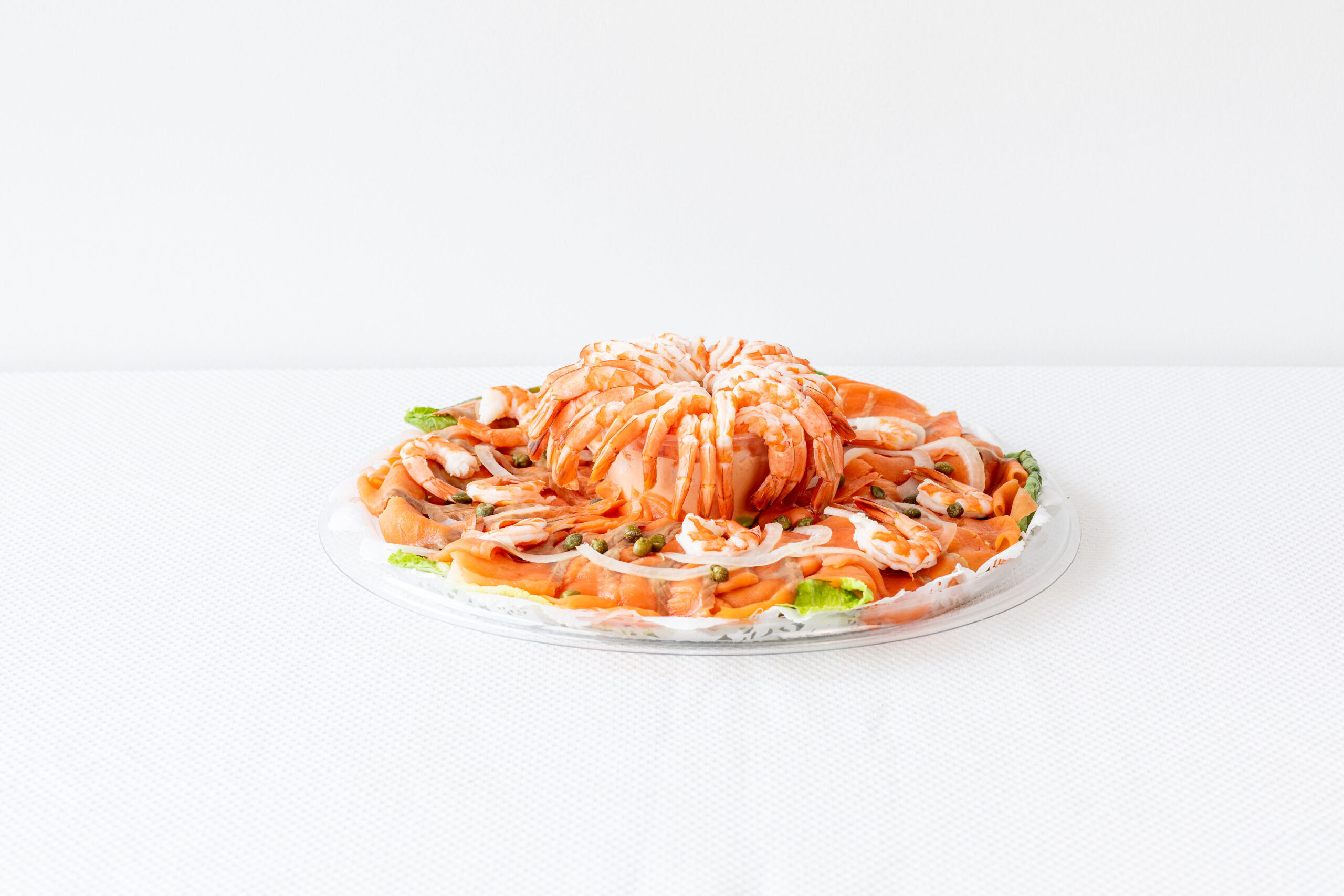 Duo raffiné de saumon fumé et crevettes fraîches avec citron et fines herbes.