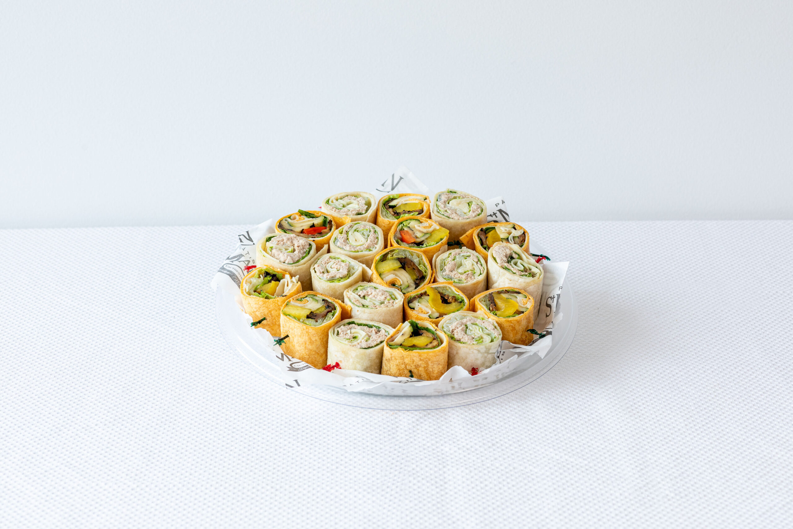 Wraps variés (poulet, légumes, fromage…) coupés en bouchées pratiques.